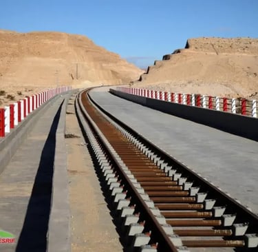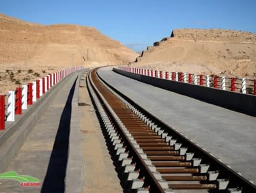 Ligne minière Est (Annaba–Tébessa, 422 km) : Axe nord-sud modernisé pour relier le port d’Annaba aux gisements d’est (Bled El Hadba, Djebel Onk). Dédoublement en cours (54 km du nord achevés, 152 km du sud fin 2024, 30 km de raccordement à Bled El Hadba réalisé)[4][5]. Une fois intégralement doublé, il transportera >10 Mt/an de phosphate et autres minerais[33], tout en relançant la desserte voyageurs/marchandises. Trente gares/haltes jalonnent cette liaison stratégique.