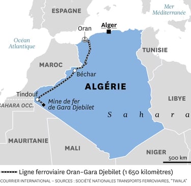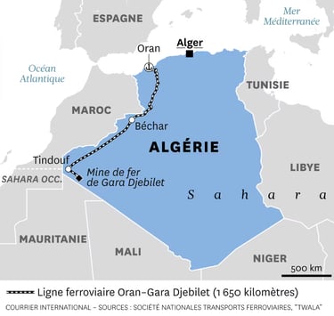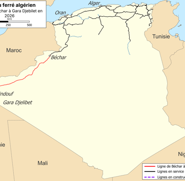 Capex & calendrier : Le budget total dépasse plusieurs milliards de dollars (d’après presse, env. 10–15 milliards$ incluant mine et chemin de fer). La ligne ferroviaire de 950 km Gara–Bechar (financée par l’État algérien) a été construite de 2023 à 2026[13]. En janvier 2026, la ligne est achevée et la première cargaison (1 000 t) est partie vers la raffinerie d’Oran, avec inauguration officielle le 1er février 2026[20][21]. La production initiale était de 500 000 t en 2025, avec un objectif de 12 Mt/an pour 2030 et potentiellement 40–50 Mt/an à long terme[22].