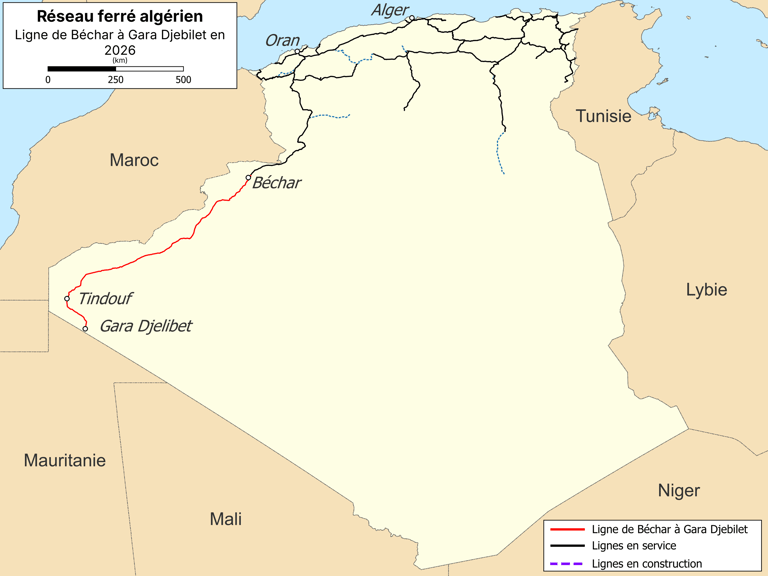 Ligne ferroviaire Gara–Béchar–Oran : Nouveau tronçon de 950 km (livré 2026) reliant la mine de Gara Djebilet à Béchar[13], puis à Oran via la ligne existante. Conçue pour 24 trains minéraliers/jour (32,5 t par essieu)[13], elle connecte le sud-ouest à l’industrie sidérurgique nord (Tosyali/Feraal) et aux ports méditerranéens (Oran, Alger). La première cargaison (1 000 t) a transité en janvier 2026 vers Oran[20][21]. Cette ligne est dédiée au minerai, complétée par le trafic passagers/marchandises sur le même gabarit.